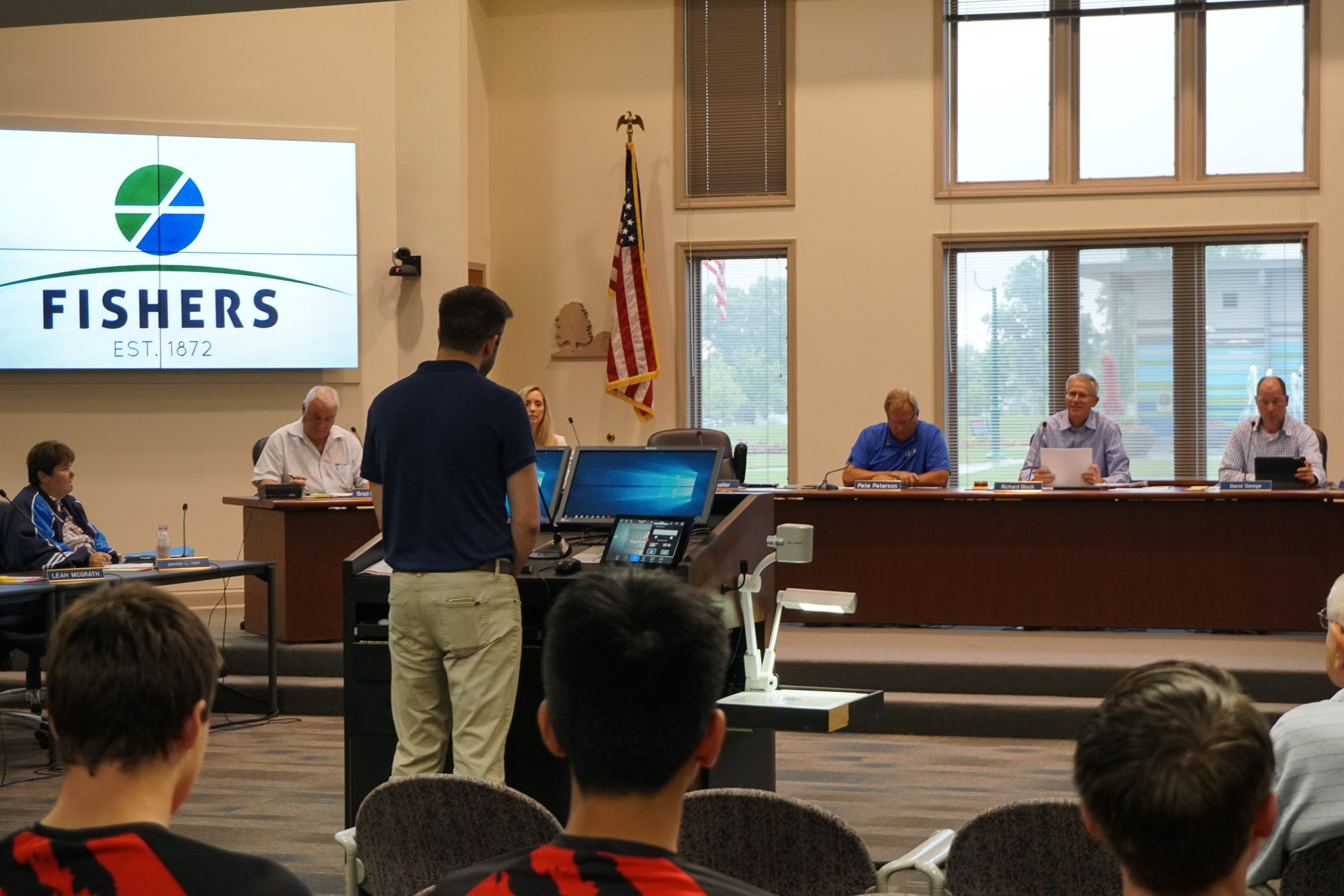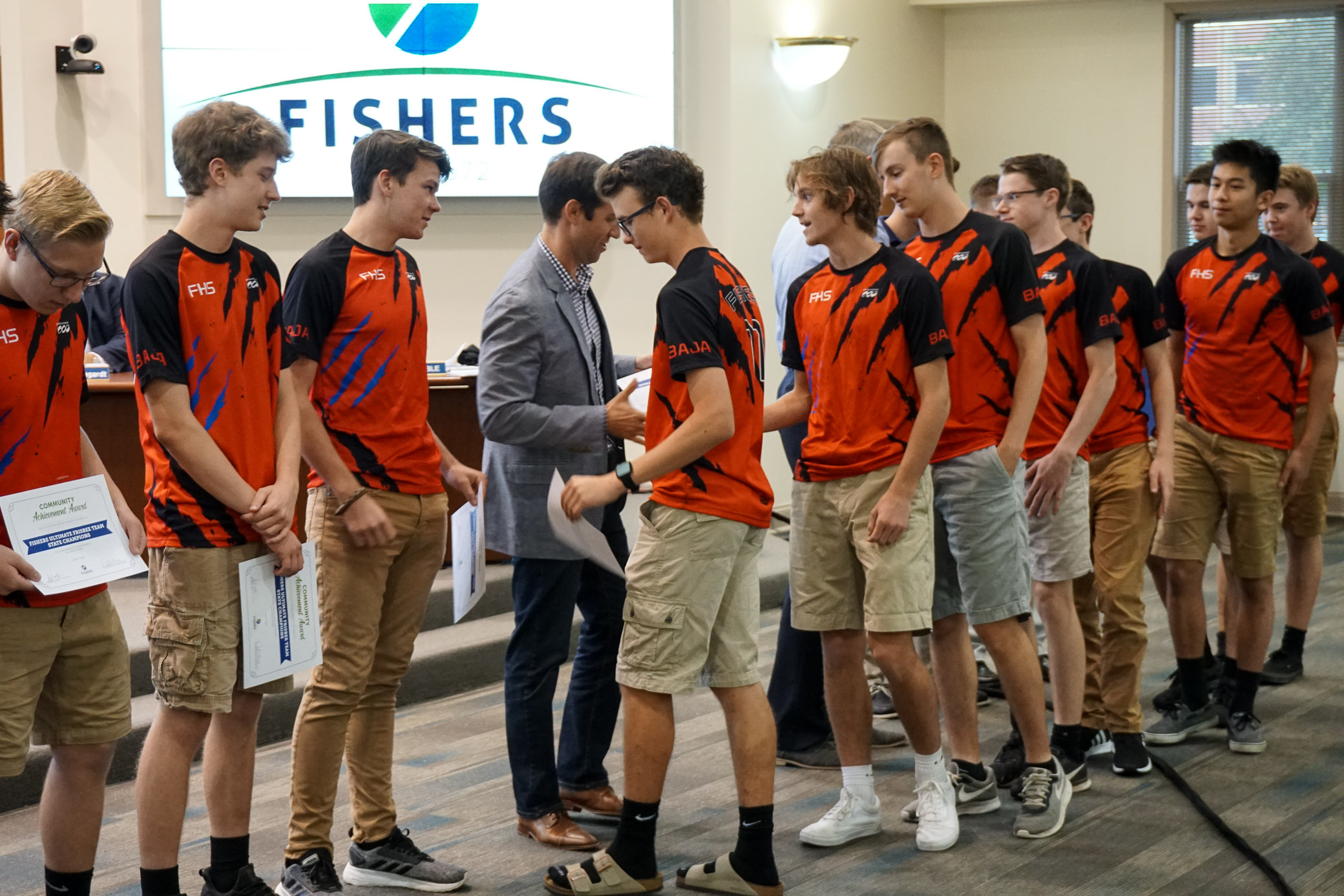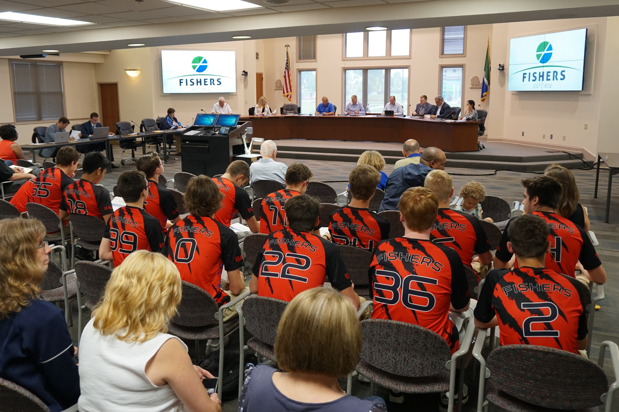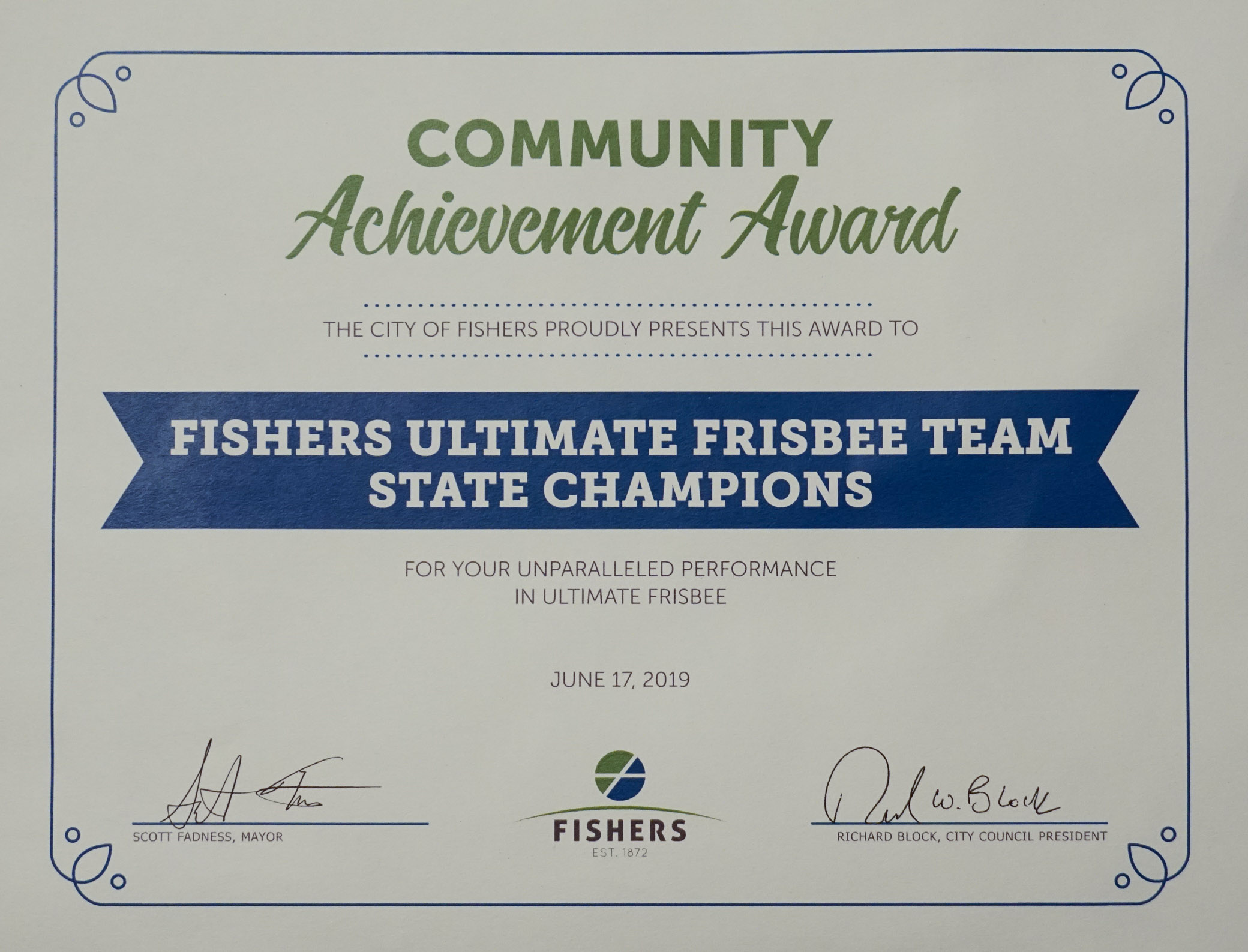 At their June 17th meeting at City Hall, the Fishers City Council officially recognized Fishers Baja for winning the 2019 Indiana Boy’s Ultimate State Championship. Members of the team received a Community Achievement Award certificate and a hearty round of applause.